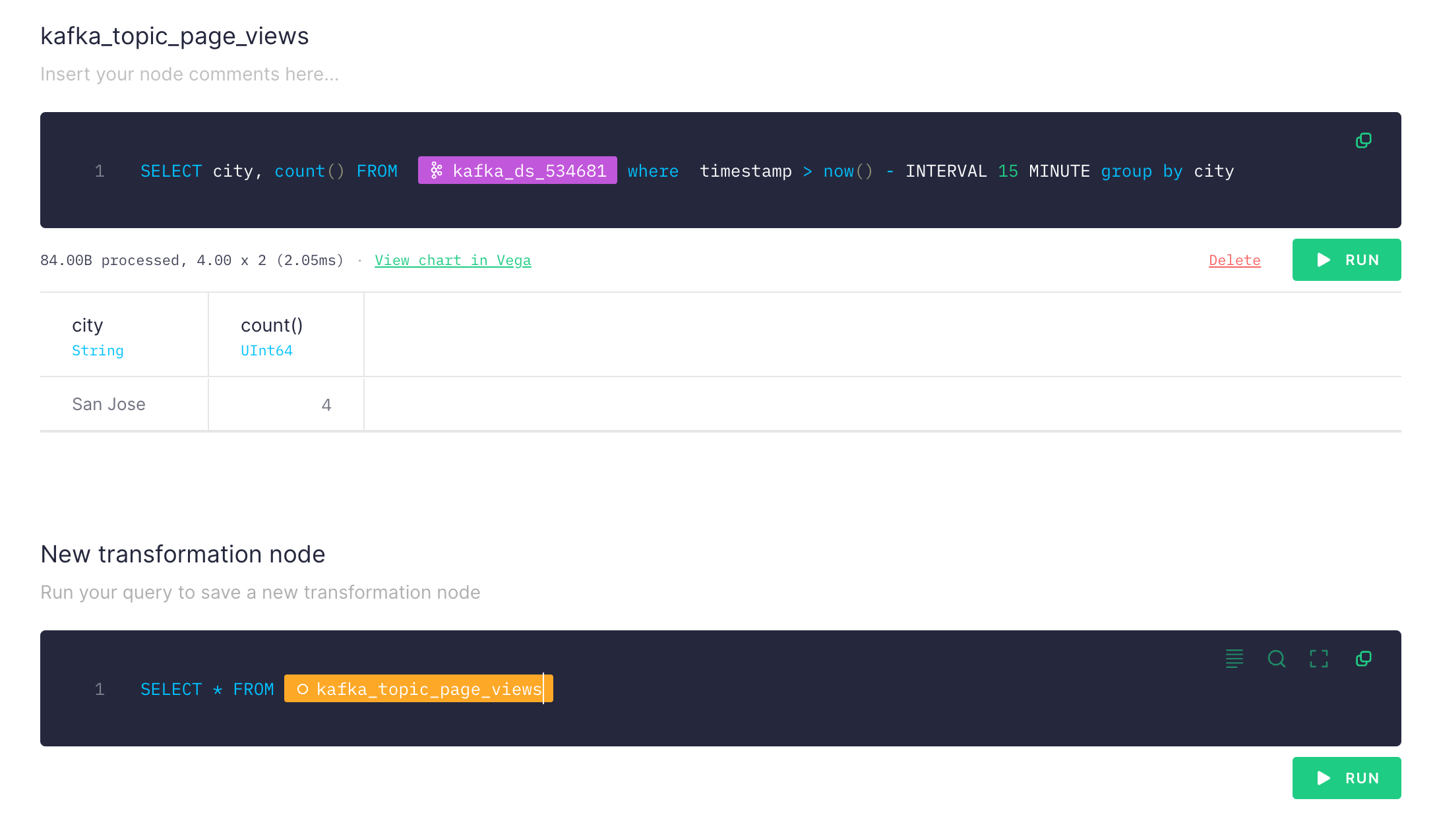 You should see the number of page view from cities in last 15 minutes. The good thing with TinyBird is you can chain queries (new transformation node) also you can add multiple data sources (e.g. Kafka topics) and join them in a single query.