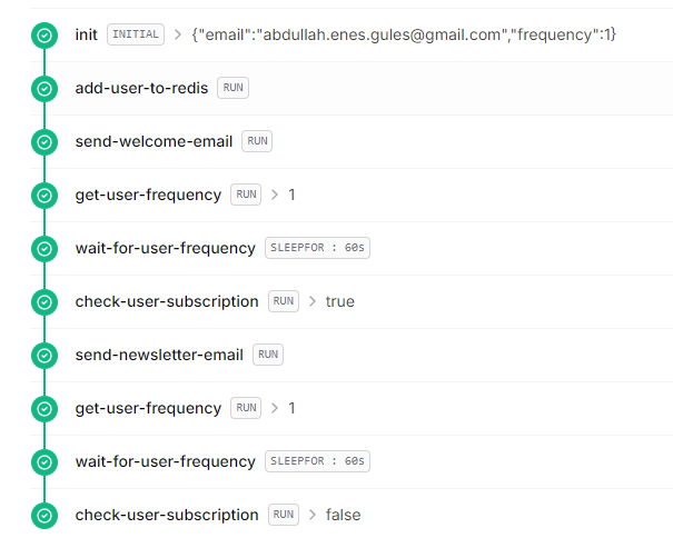 });Here's an example of a completed workflow for a user who subscribed, received a single newsletter, and unsubscribed: